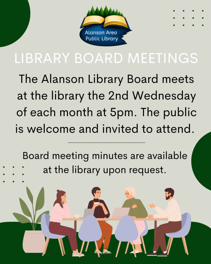 The Library Board meets at the Library the 2nd Wednesday of each month at 5pm. The public is welcome and invited to attend. Board meeting minutes are available at the library upon request.